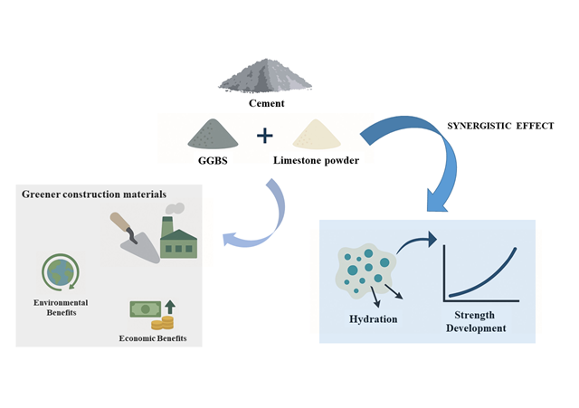 • Synergy of ground granulated blast-furnace slag and limestone powder in ternary cement: Effects on heat of hydration and strength development