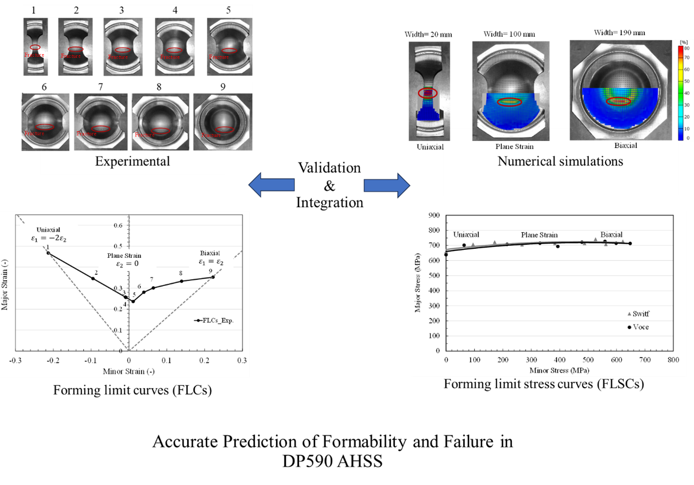 This study aims to establish an integrated experimental–numerical framework for characterizing the deformation behavior of DP590 high-strength steel sheet. The framework combines experimental uniaxial tensile and Nakajima tests with finite element (FE) simulations to provide a comprehensive assessment of forming limits and fracture behavior. Forming limit curves (FLCs) and forming limit stress curves (FLSCs) were determined with the integrated approach and then validated numerically using the Hill’48 yield criterion together with both Swift and Voce hardening laws. Model calibration incorporated experimental data on directional mechanical properties to ensure that material anisotropy was accurately represented. The FE simulations demonstrated strong agreement with the experimental data across uniaxial, plane-strain, and biaxial loading paths. The Swift hardening law consistently predicted higher forming limit stresses and more accurate drawing-depth estimates than the Voce law, particularly under biaxial and plane-strain conditions. The novelty of this work lies in the simultaneous validation of both strain- and stress-based forming limits, combined with the quantitative prediction of drawing depths, which has rarely been reported for DP590 grade. The proposed framework improves the predictive accuracy of forming simulations and provides practical guidelines for material characterization and process optimization in the automotive and related manufacturing industries.